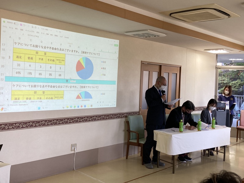 フロアの新たな体制や、行事紹介、食事や生活においてのアンケート結果をご報告いたしました。