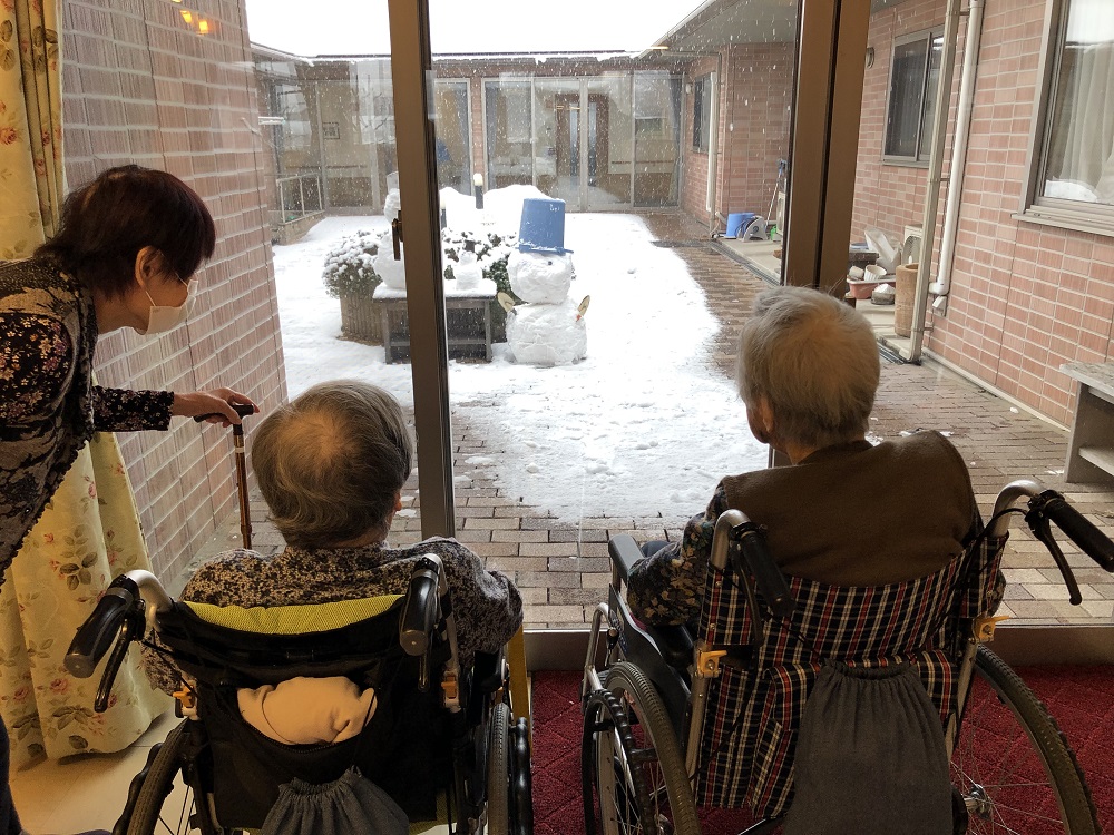 雪だるまつくろー!! 投稿日:2023年2月10日 2023年2月10日 今日は館林市でも朝から雪が降り続いております。 せっかく雪が積もったのでみんなで雪だるまを作りました。 お客様は食堂の暖かい所から応援してくれました。
