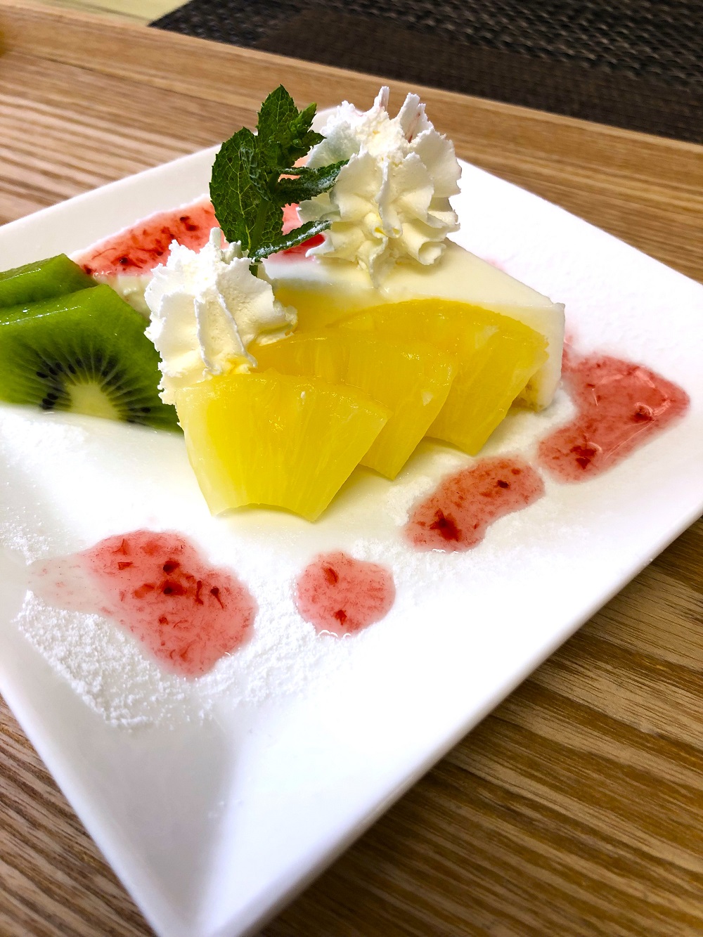 本日のスイーツは、『レアチーズケーキ~イチゴソースがけ~』。