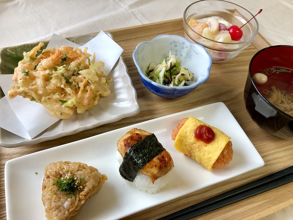 ごちそうおにぎり(オムライス・つくね・そばめし)、さくら海老のかき揚げ、カブと塩昆布の白だし浅漬け、ヨーグルトフルーツサラダ、お吸い物。