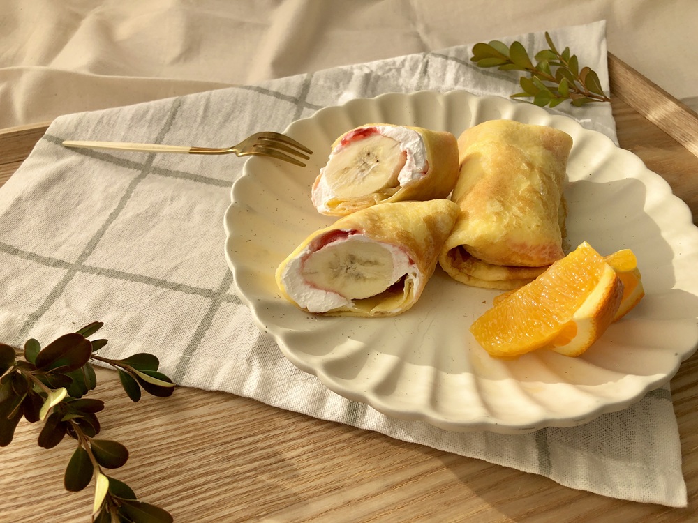 ホイップクリーム、バナナ、いちごソースを焼きたてのクレープ生地で包んでおります。